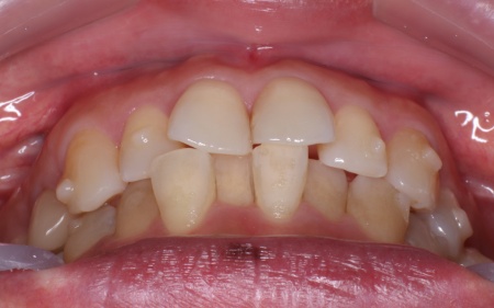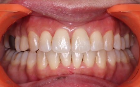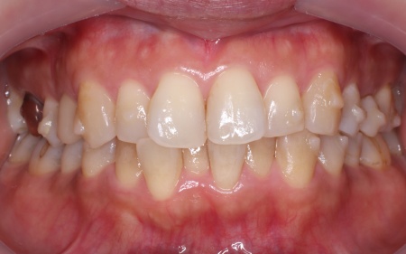 | 診断 | 拝見したところ、全体的に歯がねじれたりずれたりしてデコボコに生えていました。 そのため笑ったときの見た目に影響が出ているだけでなく、噛み合わせのバランスも乱れています。 噛み合わせが悪い状態が続くと一部の歯に過度な負担がかかり、歯の表面が削れたり割れたりするリスクや、歯ぐきの炎症を引き起こすおそれがあります。 以上のことから、全体の矯正治療を行うことによって見た目だけでなく噛み合わせの改善も期待できると診断しました。 |